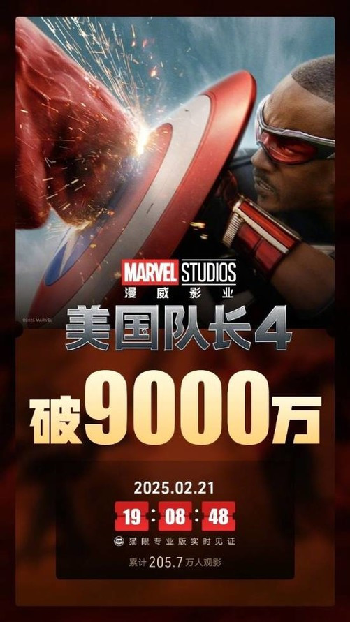 美国队长4:勇敢新世界于2月14日上映,根据相关数据统计,截至2月21日,该片票房突破9000万元。这一成绩仅相当于前作美国队长3首日票房的50%,成为该系列中票房增长最慢的一部。预测显示,该片最终总票房可能停留在1.25亿元左右,与美国队长3取得的12.46亿元相比,缩水幅度接近90%。
